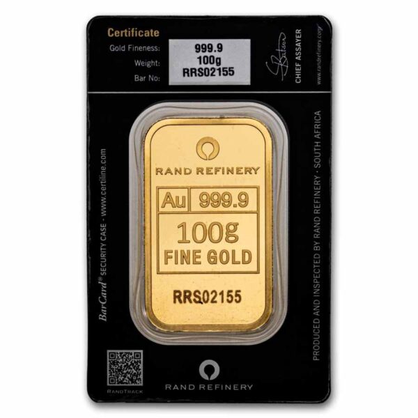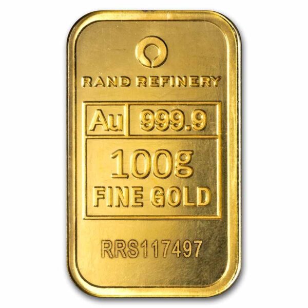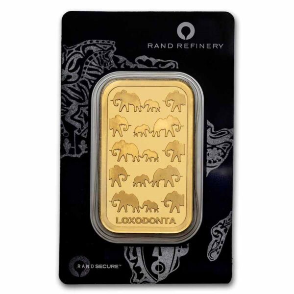 De producent van de wereldberoemde Krugerrand slaat sinds kort ook goudbaren. De Rand Refinery 100 gram goudbaar bevat .9999 (24 karaats) puur goud. De goudbaar wordt geleverd in een blisterverpakking die tevens dient als certificaat van echtheid. Op de achterzijde van de goudstaaf zien we een herhalend ontwerpelement dat het Afrikaanse continent weerspiegelt. In dit ontwerp worden herhaaldelijk een moederolifant en haar kleine kalf in een rij getoond. Terwijl één lijn van het ontwerp van rechts naar links beweegt, beweegt de lijn eronder van links naar rechts, enzovoort langs de voorkant van de balk. Het kleine kalf gebruikt zijn slurf om de staart van zijn moeder vast te houden, zodat hij dichtbij kan blijven. Op de voorzijde